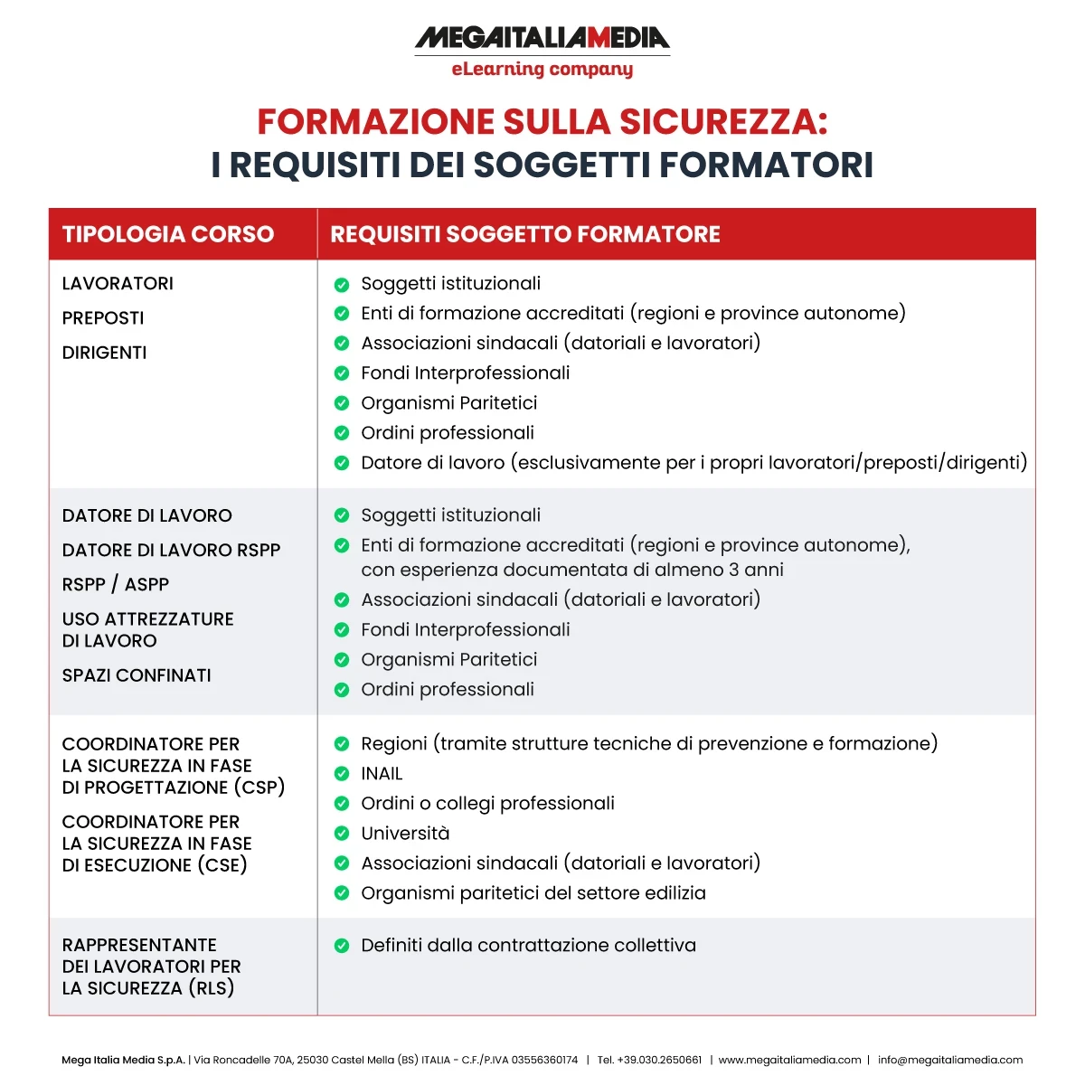 Per offrire una panoramica immediata dei requisiti richiesti ai diversi soggetti formatori e delle specifiche competenze richieste per ciascuna tipologia di corso, riportiamo di seguito una infografica di sintesi. La tabella mette a confronto le principali categorie di corsi con i soggetti autorizzati a erogarli, evidenziando in modo chiaro quali enti possono assumere il ruolo di formatore in base alle prescrizioni del nuovo Accordo 2025. Questa rappresentazione visiva consente di cogliere rapidamente differenze, limitazioni e requisiti specifici richiesti a ciascun soggetto.